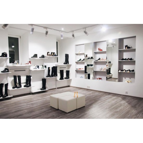 Wyposażenie sklepu obuwniczego opiera się gównie na systemach mebli. Użycie regałów metalowych lub np. paneli Space Wall z ruchomymi półkami i wieszakami zapewni najlepszy z możliwych sposobów ekspozycji towarów.