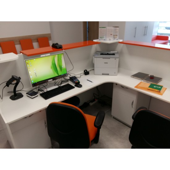 Wykonane białej i pomarańczowej płyty. Kątowa lada recepcyjna. Podstawowa dla kątowej są gładkie białe deski, i pomaranczowym na białym tle. Założone podświetlenia, a należą do nich logo firmy lub marki.